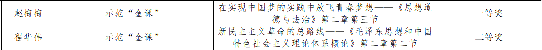 教师在多个评审类别中表现突出,获批2门高校思政样板课程,喜获一等奖7项、二等奖1项,展现了学校在思想政治理论课改革创新与内涵建设方面取得的扎实成效。