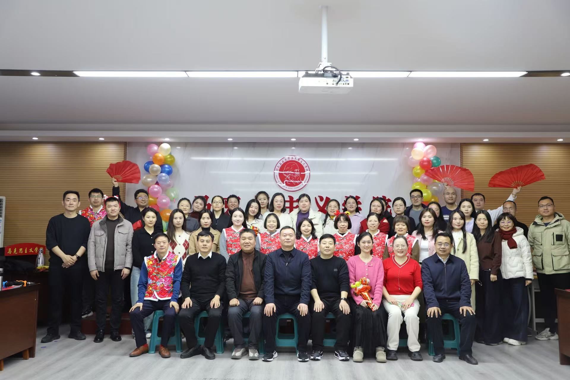 联欢会的表演正式拉开帷幕。各教研室教师们各展所长,带来了一场兼具思想性与观赏性的视听盛宴。马克思主义基本原理教研室的歌曲联唱《时代歌声》,在旋律中传递时代脉搏;习近平新时代中国特色社会主义思想概论教研室的三句半《三尺讲台话新春》,以接地气的形式讲述讲台故事,妙趣横生;毛泽东思想和中国特色社会主义理论体系概论教研室的舞蹈《越来越好》,用灵动舞姿展现对生活与工作的美好期许;中国近现代史纲要教研室的《春天的故事》《万疆》歌曲联唱,带领大家重温峥嵘岁月、感受盛世繁华;思想道德与法治教研室的配音表演《现状》传递生活温情,歌曲《国家》《不要慌太阳下山有月光》则分别诠释家国情怀与从容心境;国家安全教育教研室的《朋友》温馨动人,彰显同事间的深厚情谊;形势与政策教研室的《习近平2026年新年贺词金句摘编》朗诵,让大家在金句中汲取奋进力量;此外,老师们独唱的苏联歌曲带来了别样的听觉体验,《蓝莲花》唱出坚守与向往,将联欢会的氛围一次次推向高潮。活动期间,游戏与抽奖环节穿插其间, “马年猜猜乐”、“欢乐踩气球”、“抢凳子”等经典游戏为联欢会增添了浓厚的欢乐氛围,让现场欢声笑语不断。